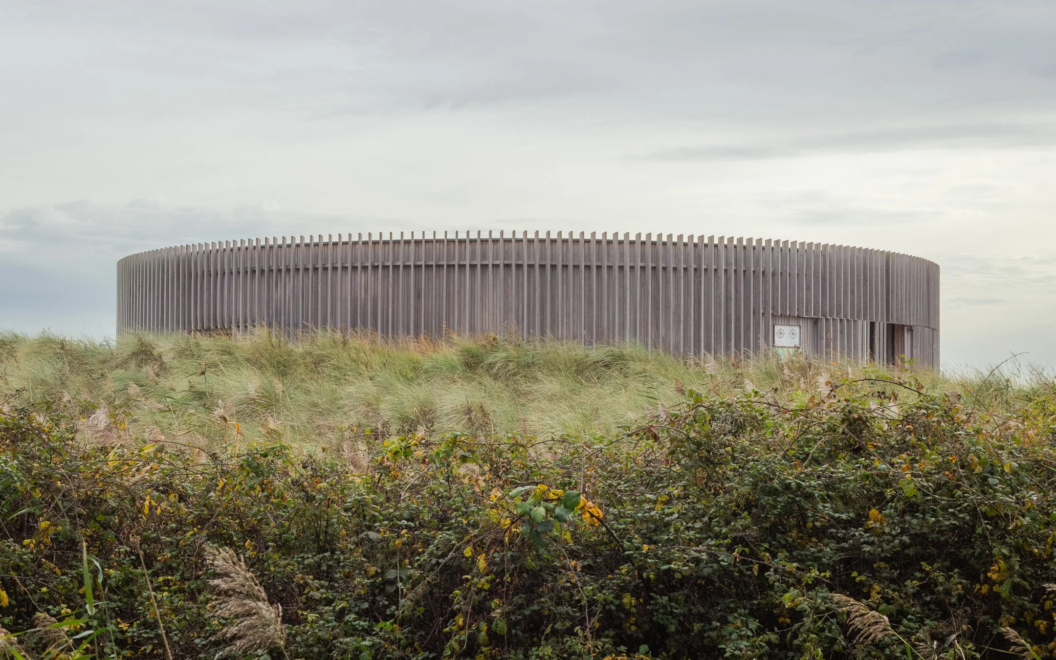 The vertical timber fins echo the rhythm of the reeds across the marsh, and the circular form settles into the dunes with a sense of calm. It feels less like a structure placed on the landscape and more like an extension of it, defined by rhythm, repetition, and intent.